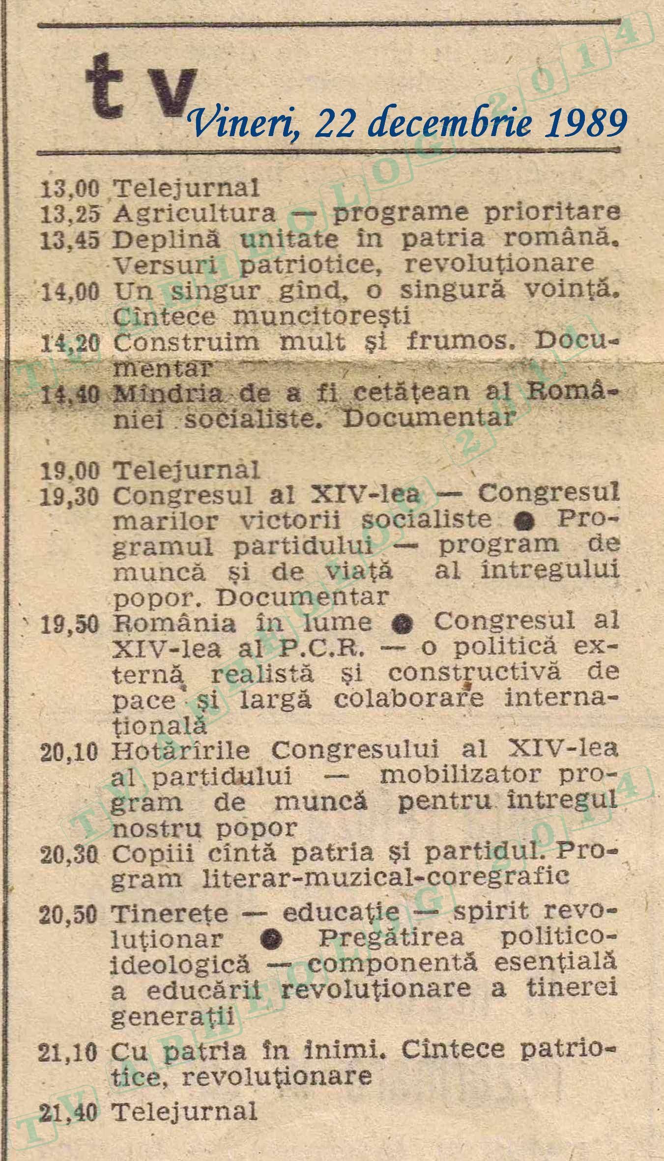 În acel decembrie 1989, așteptam eu surescitat ziua și ora stabilite de Europa Liberă. Nu știam dacă voi avea îndrăzneala să mă raliez urzelii. În 22 decembrie, televiziunea a bulversat economia ceaușistă, acordându-le ecranul, la o oră la care n-ar fi trebuit să difuzeze nimic, lui Dinescu, Caramitru, Iliescu. Programul normal era ăsta: