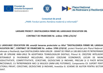 ML LANGUAGE EDUCATION SRL anunță finalizarea proiectului cu titlul ”DIGITALIZAREA FIRMEI ML LANGUAGE EDUCATION SRL”, CONTRACT DE FINANȚARE Nr. ordine:...