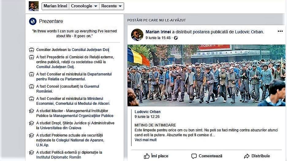 Marian Irinei, cândva cea mai vocală prezență a Opoziției în CJ, pare să fi fost singurul liberal care a știut de mitingul PSD de pe 9 iunie. Aflase de la Președintele Orban și i-a dat share la postare, însă fără par, adică nu a comentat, nu a emis vreo opinie personală pe subiect.
