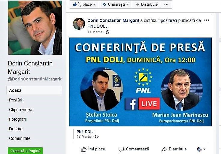 Mărgărit Dorin, ca și șeful său de organizație, are o pagină de „like”. Inactiv și pierdut în timp, invitându-ne, cu o ultimă postare din martie, la o conferință de presă.