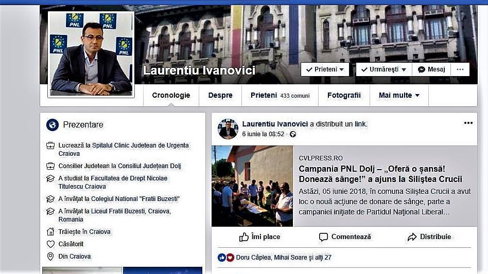 Laurențiu Ivanovici, fost vicepreședinte al Consiliului Județean Dolj în vremurile USL-ului, angajat la stat, e tăcut pe Facebook, tot așa cum este și în ședințele CJ. Ultima lui postare: 6 iunie, despre o campanie de donare de sânge.