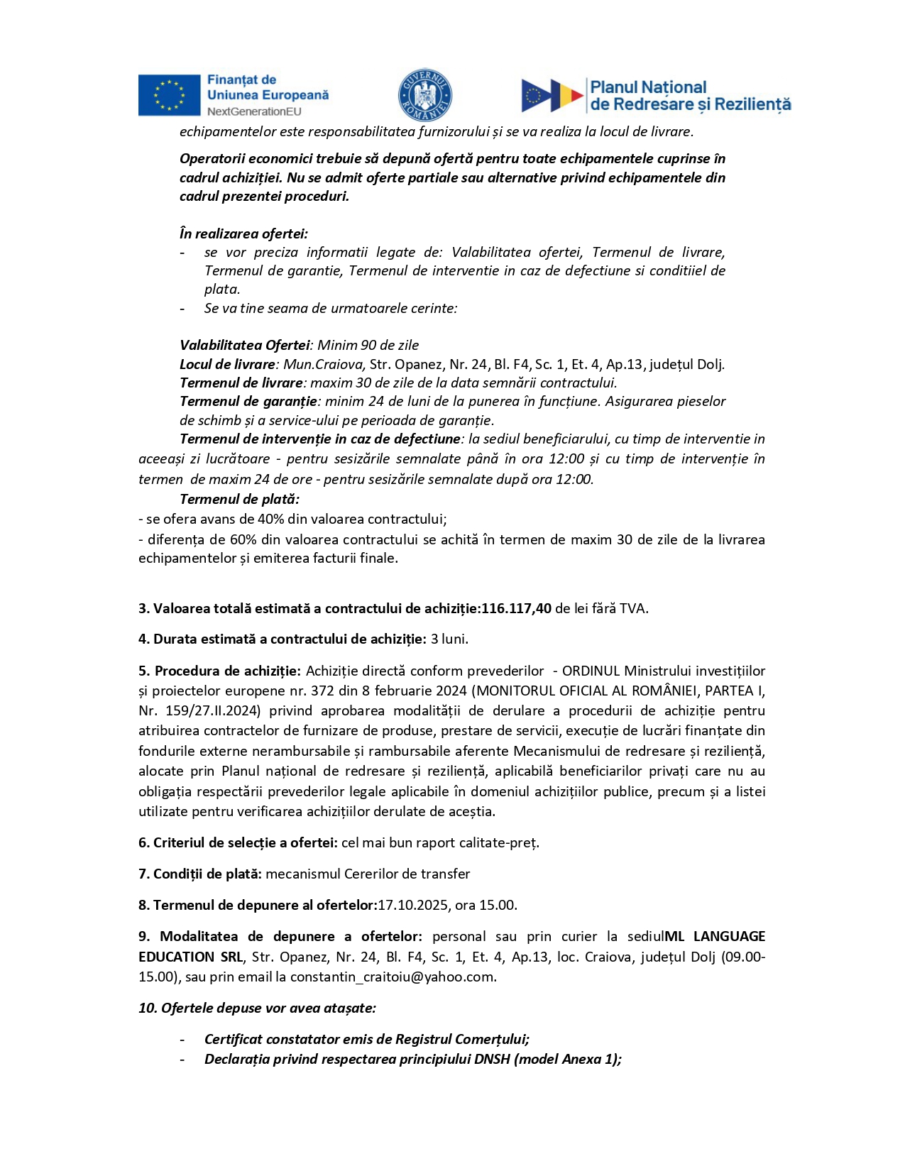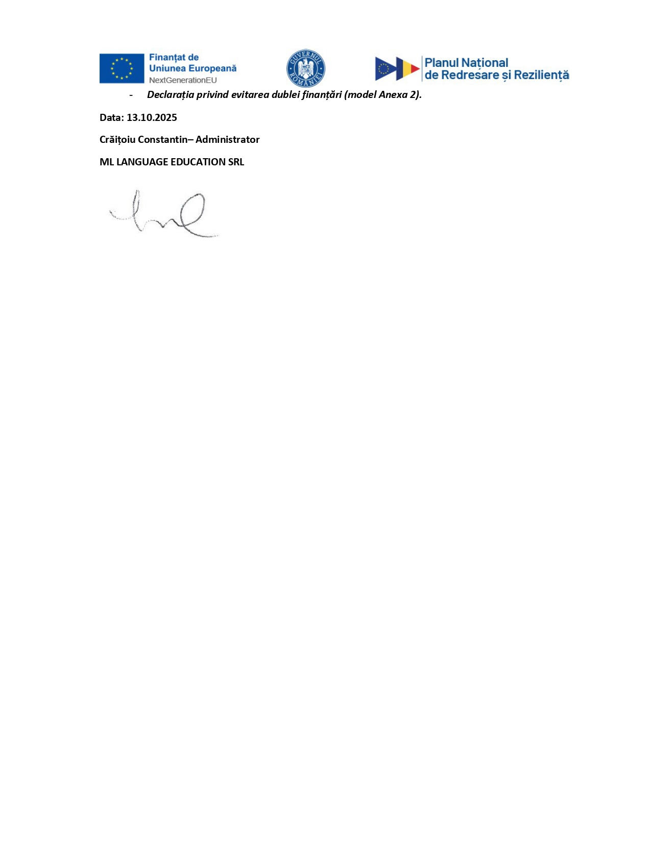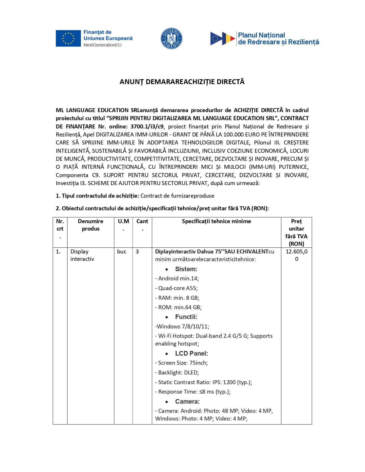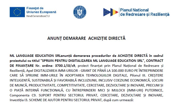 ML Language Education SRL anunță demararea procedurii de achiziție directă în cadrul proiectului „Sprijin pentru digitalizarea ML Language Education SRL”, finanțat prin Planul Național de Redresare și Reziliență (PNRR) – Componenta C9 „Suport pentru sectorul privat, cercetare, dezvoltare și inovare”, investiția I3 „Scheme de ajutor pentru sectorul privat”.