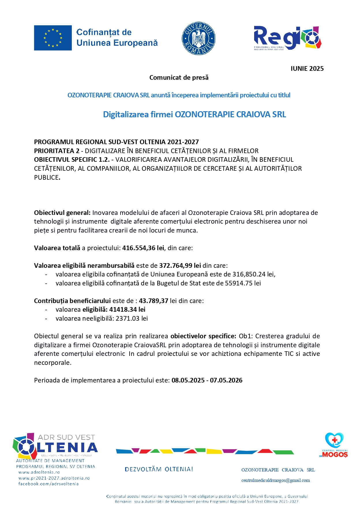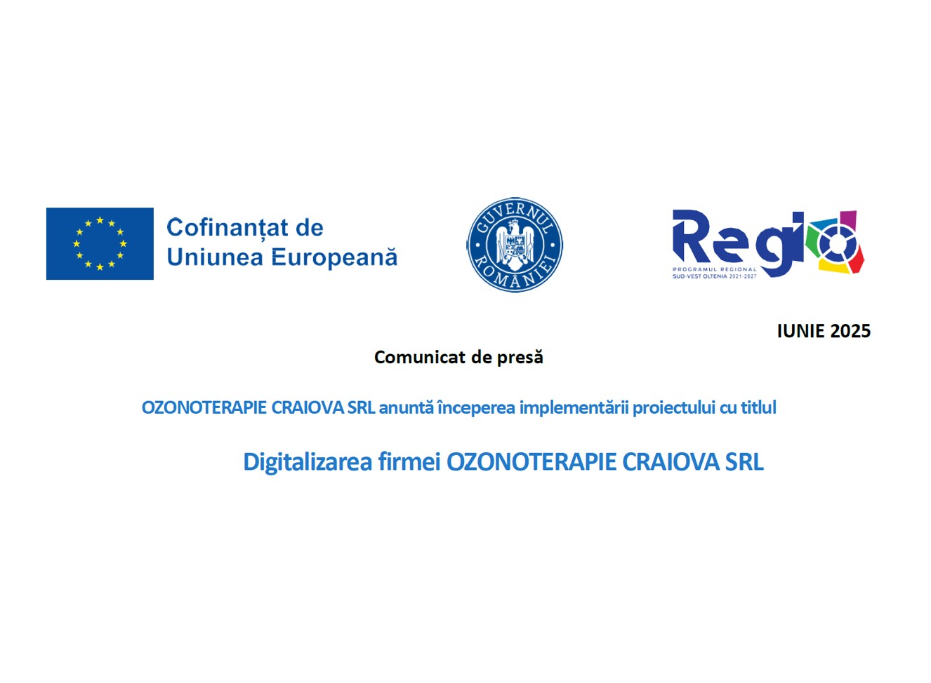 Comunicat de presa incepere proiect „Digitalizarea firmei OZONOTERAPIE CRAIOVA SRL”