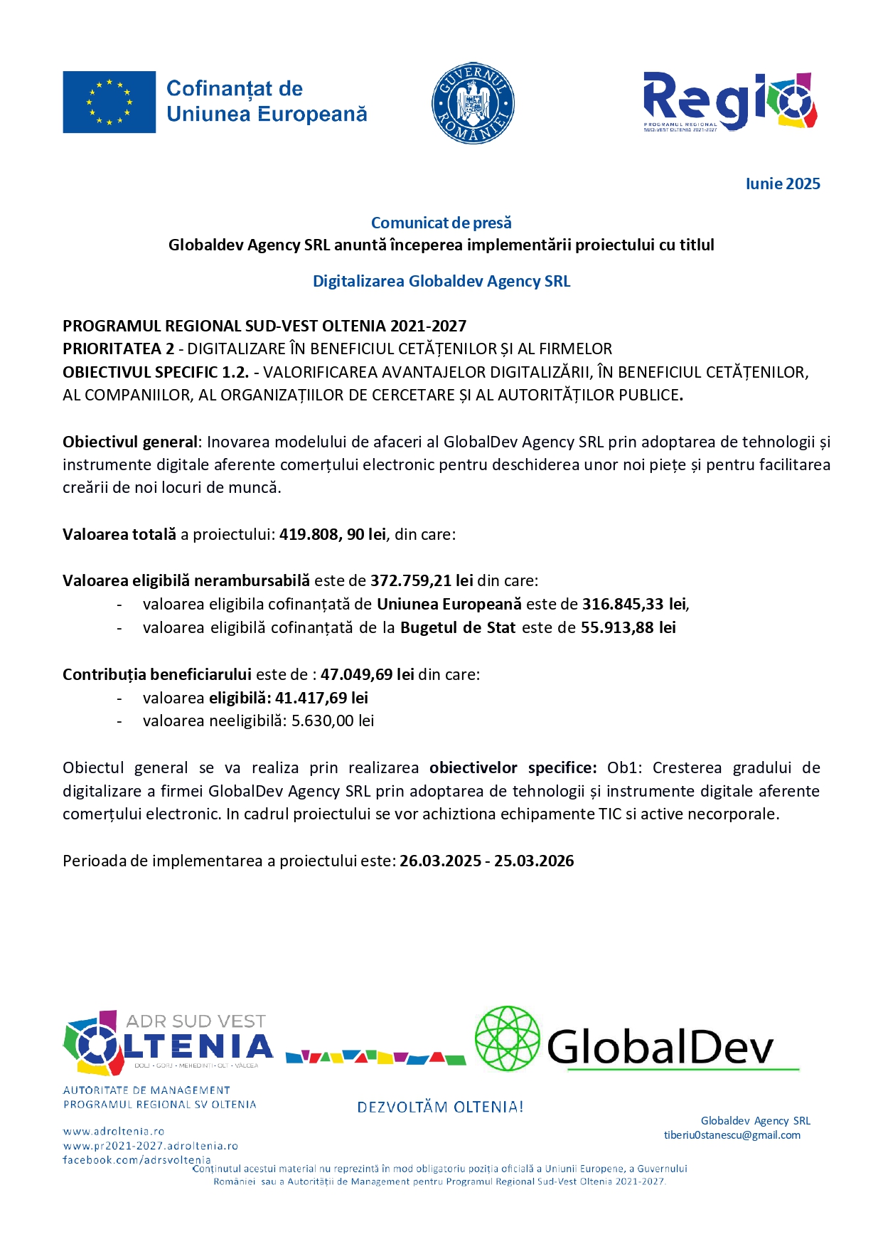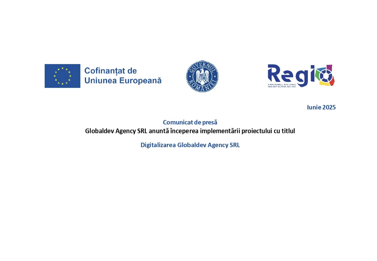 Comunicat de presă începerea implementării proiectului cu titlul Digitalizarea Globaldev Agency SRL