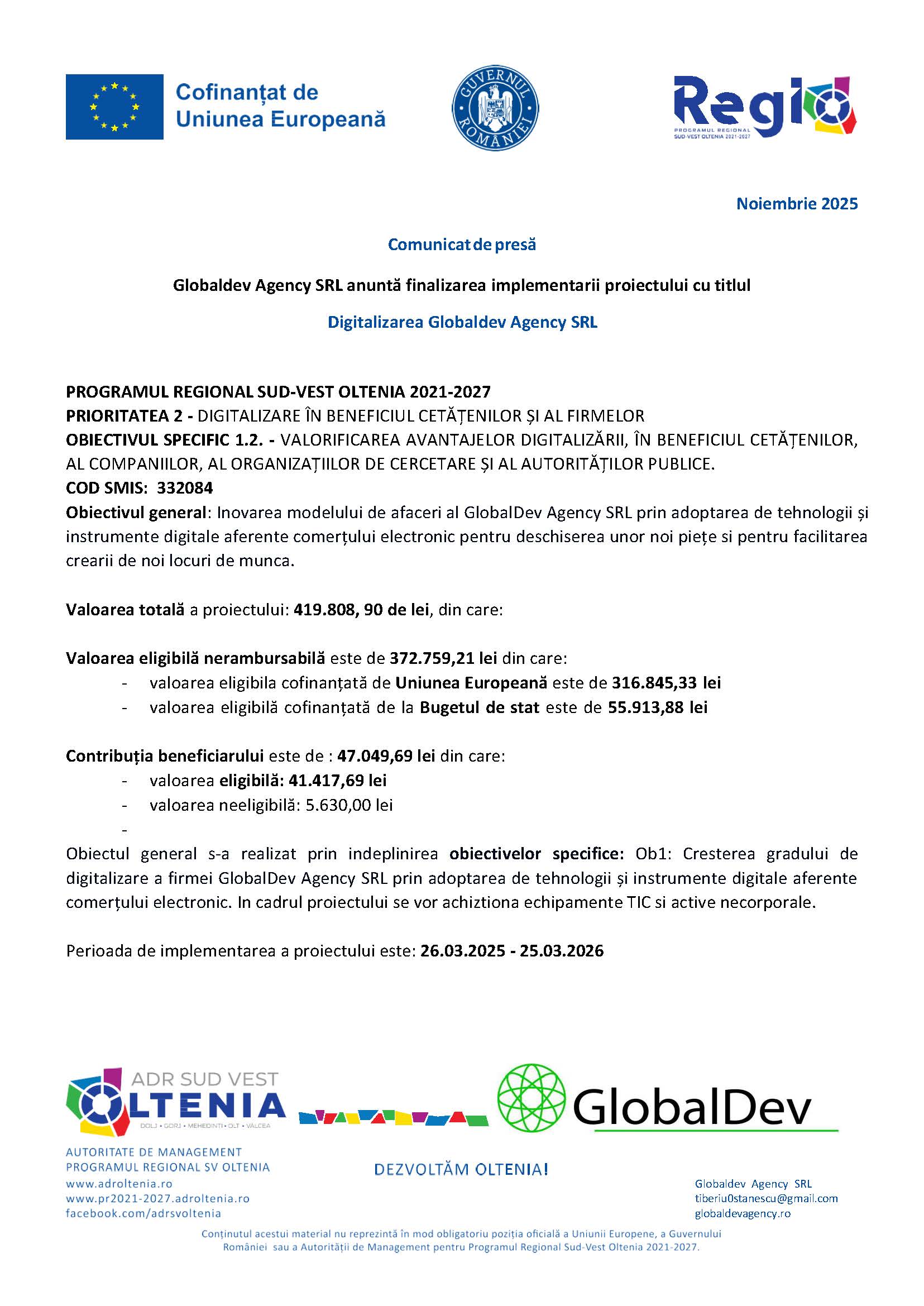 Globaldev Agency SRL anunță finalizarea implementării proiectului „Digitalizarea Globaldev Agency SRL”, finanțat prin Programul Regional Sud-Vest Oltenia 2021–2027, Prioritatea 2 – Digitalizare în beneficiul cetățenilor și al firmelor.