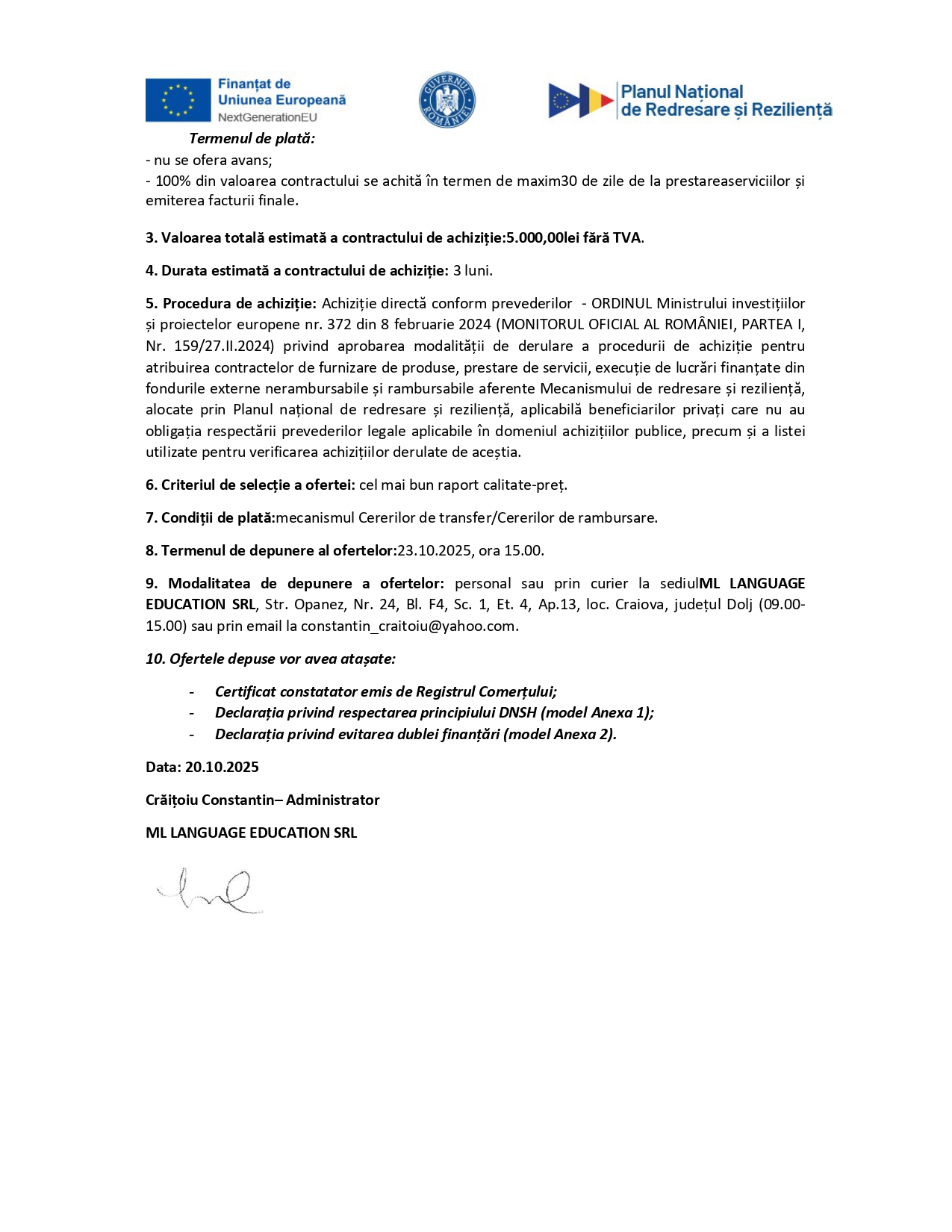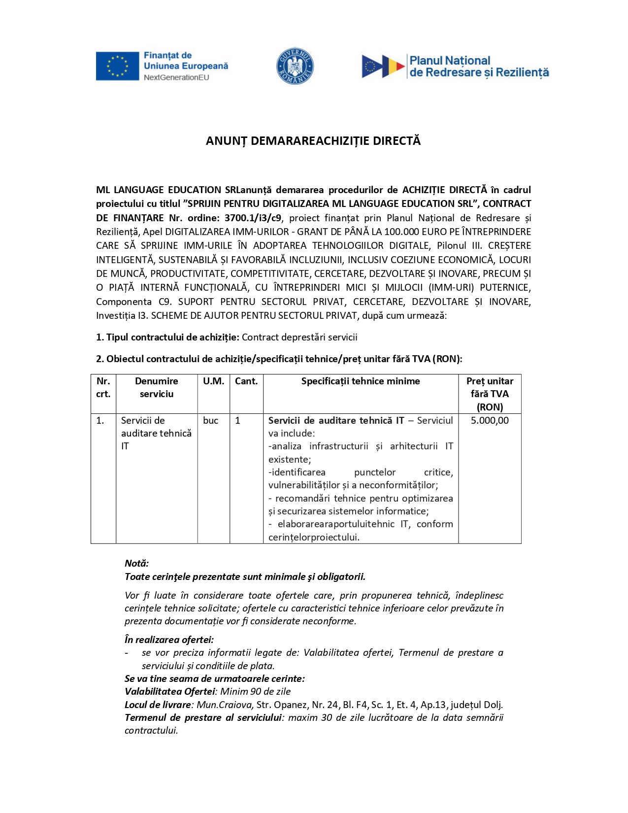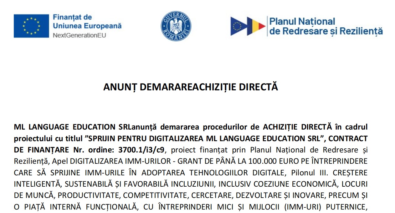 ML LANGUAGE EDUCATION SRL anunță lansarea procedurii de achiziție directă pentru prestarea de servicii de auditare tehnică IT, în cadrul proiectului „Sprijin pentru digitalizarea ML LANGUAGE EDUCATION SRL”, finanțat prin Planul Național de Redresare și Reziliență (PNRR) – apelul Digitalizarea IMM-urilor.