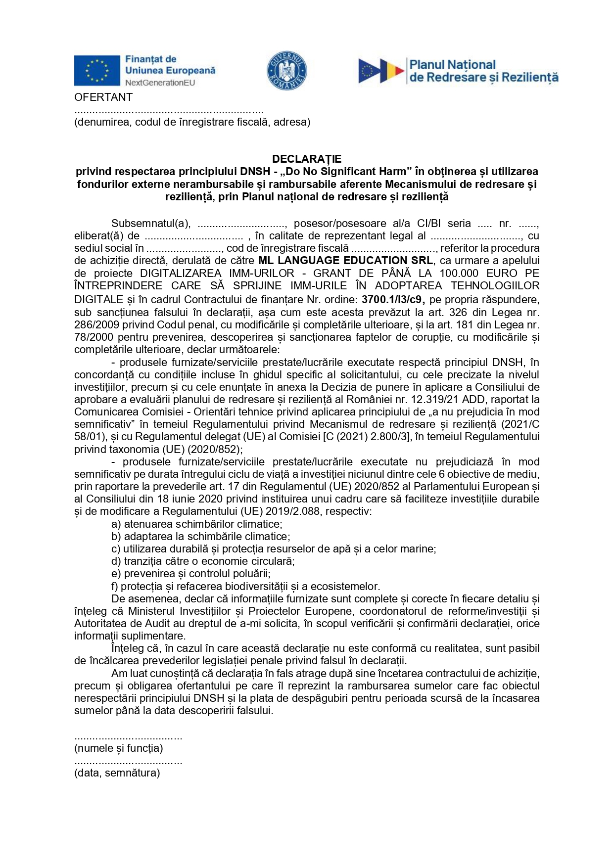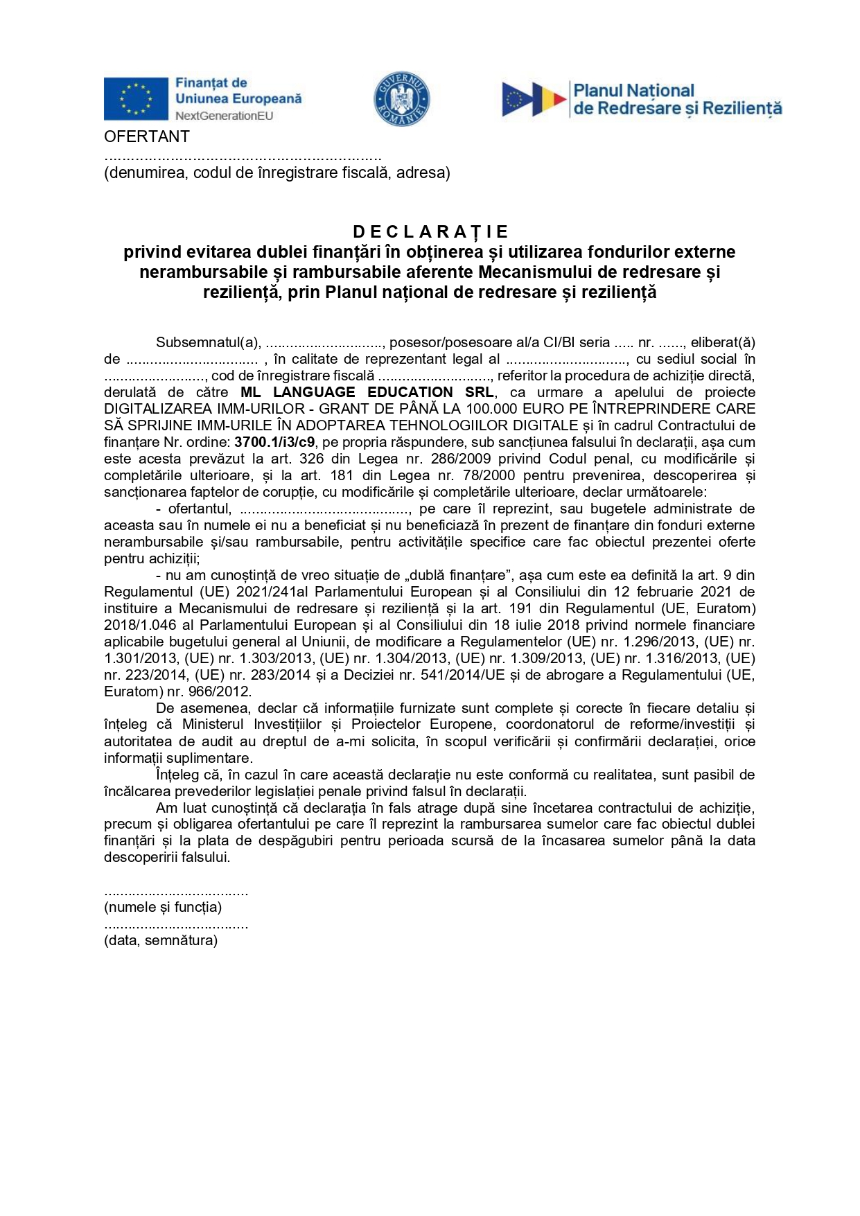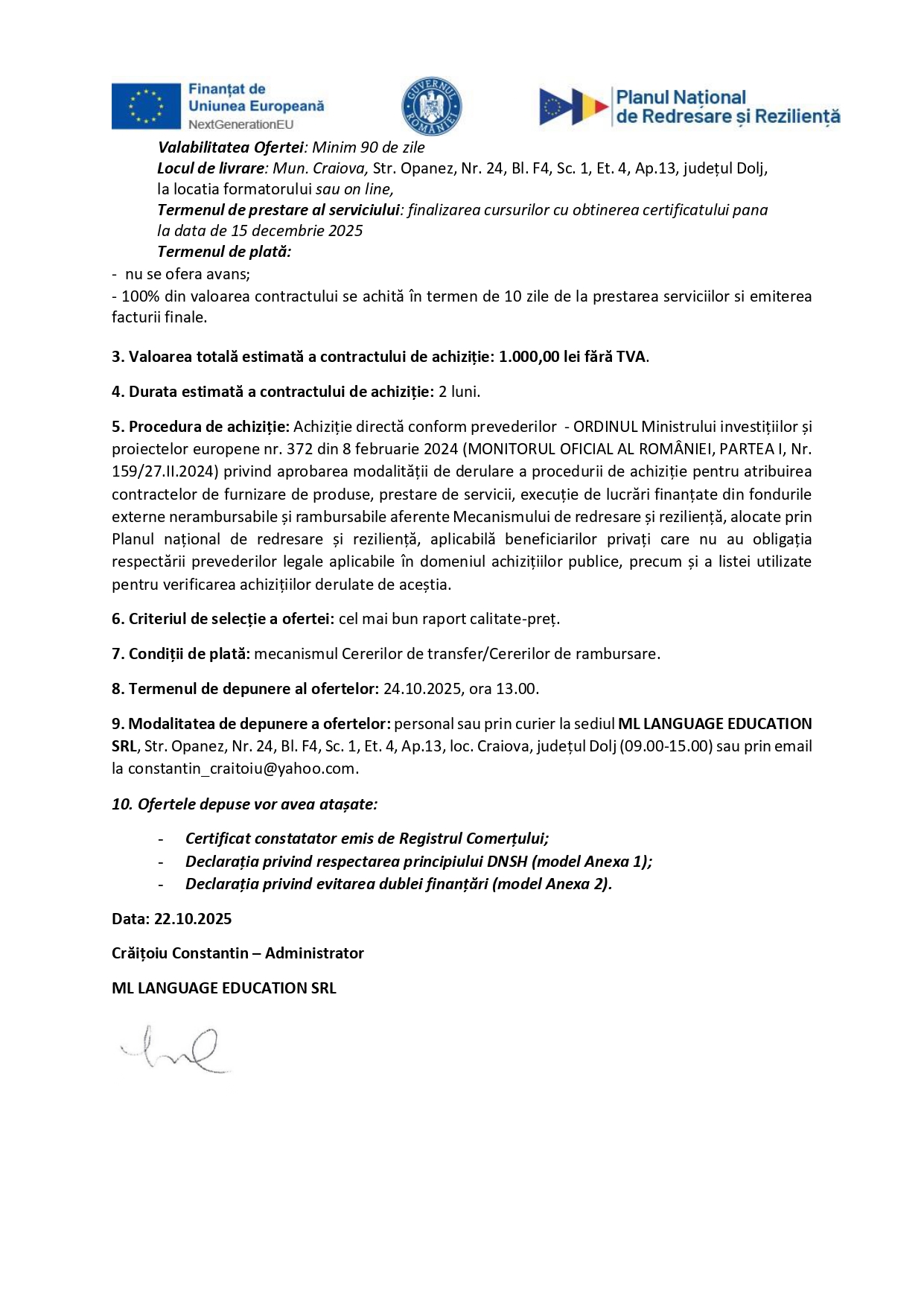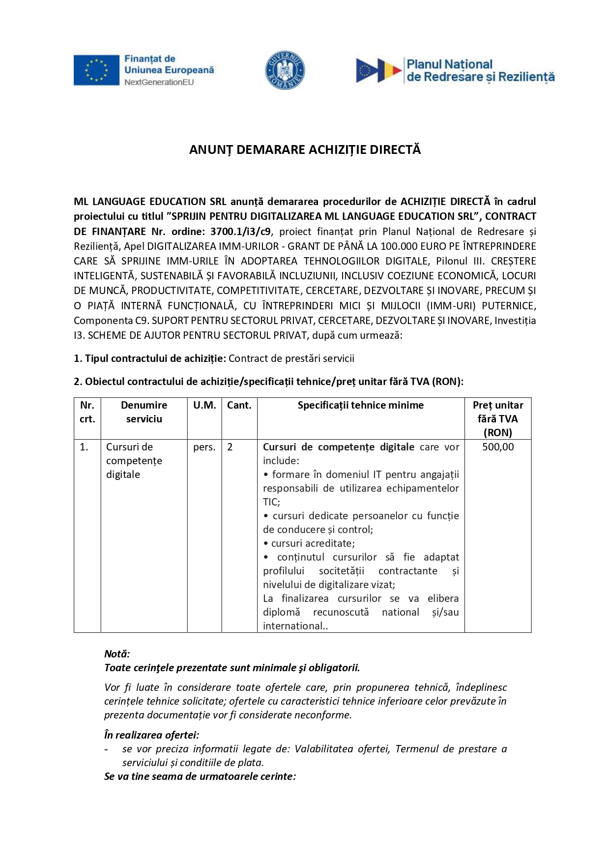 ML LANGUAGE EDUCATION SRL anunță demararea procedurii de achiziție directă pentru servicii de cursuri de competențe digitale, în cadrul proiectului „Sprijin pentru digitalizarea ML LANGUAGE EDUCATION SRL”, finanțat prin Planul Național de Redresare și Reziliență (PNRR), componenta C9 – Suport pentru sectorul privat.