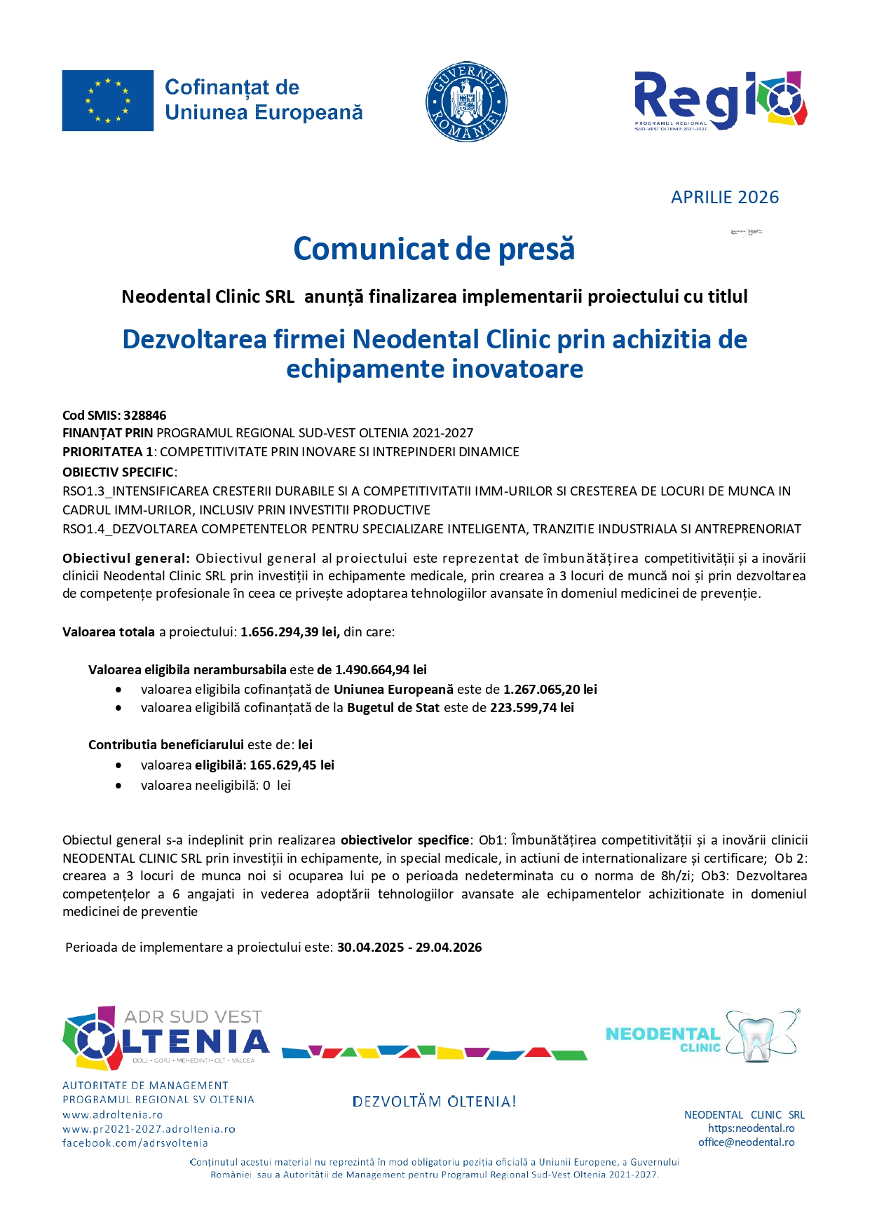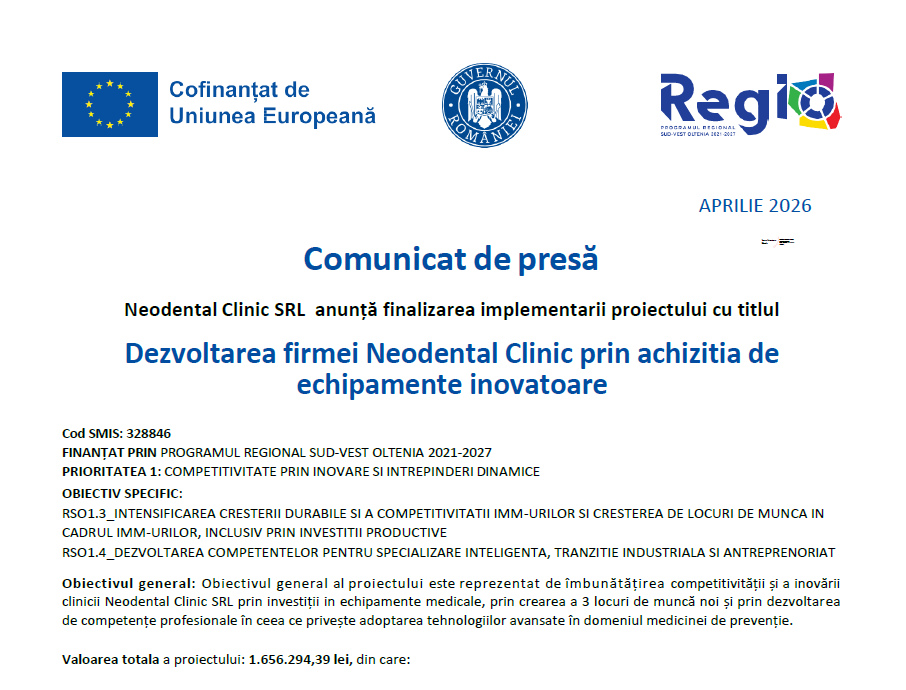 Neodental Clinic SRL anunță finalizarea implementarii proiectului cu titlul Dezvoltarea firmei Neodental Clinic prin achizitia de echipamente inovatoare
